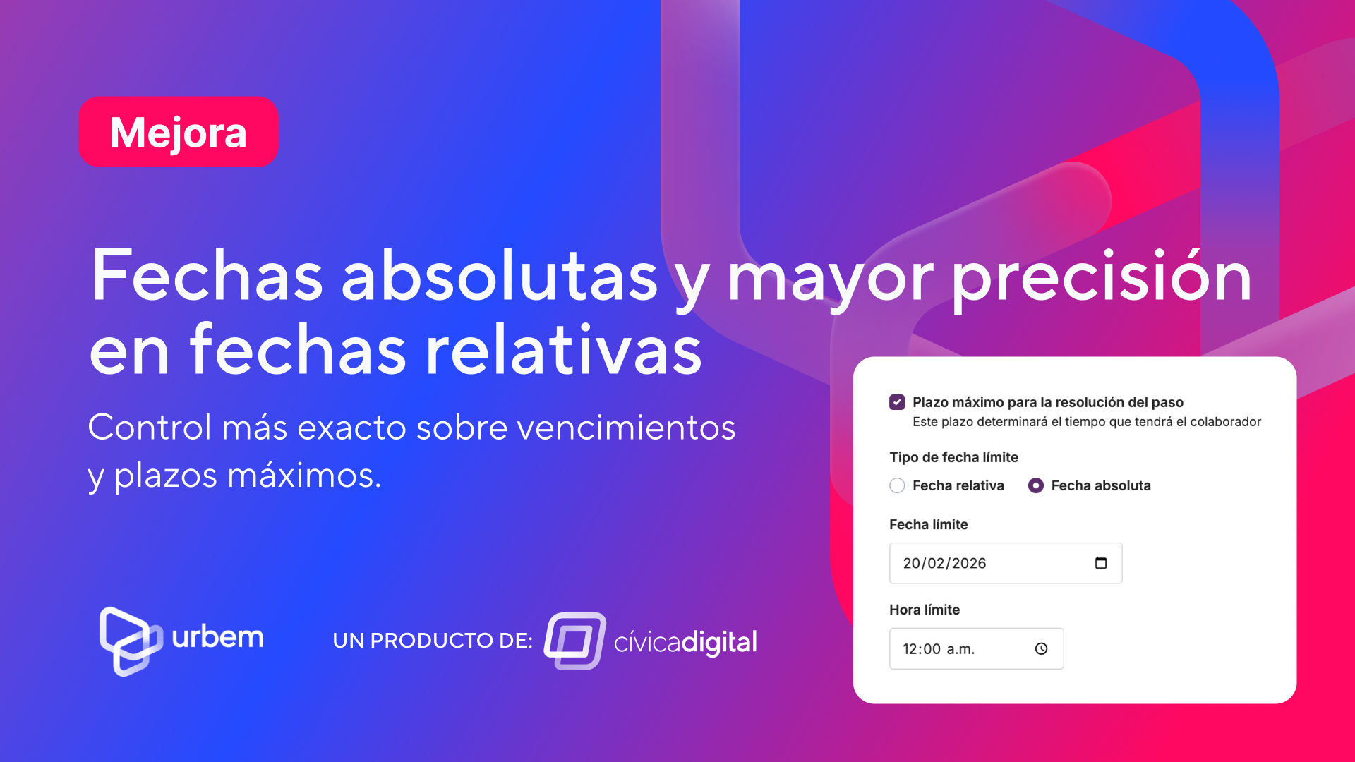 Ahora los pasos de un trámite pueden configurarse con una fecha absoluta específica, además de las fechas relativas que ya existían (por ejemplo, 5 días hábiles). También es posible incluir una hora exacta en las fechas relativas, brindando mayor precisión en la definición de vencimientos y tiempos de atención. Esta mejora permite una gestión más puntual y controlada de los procesos.